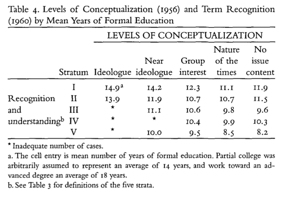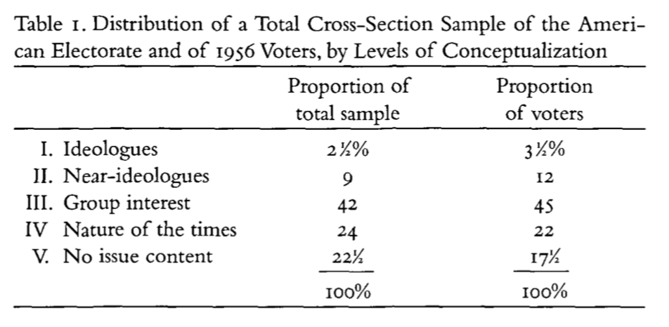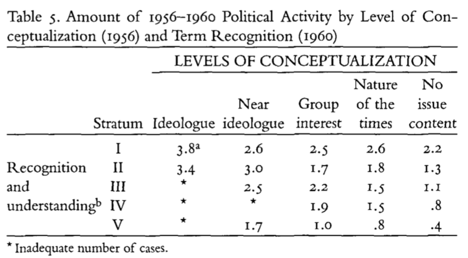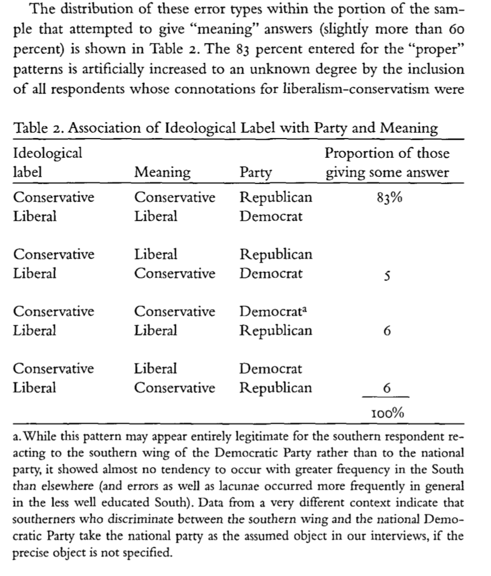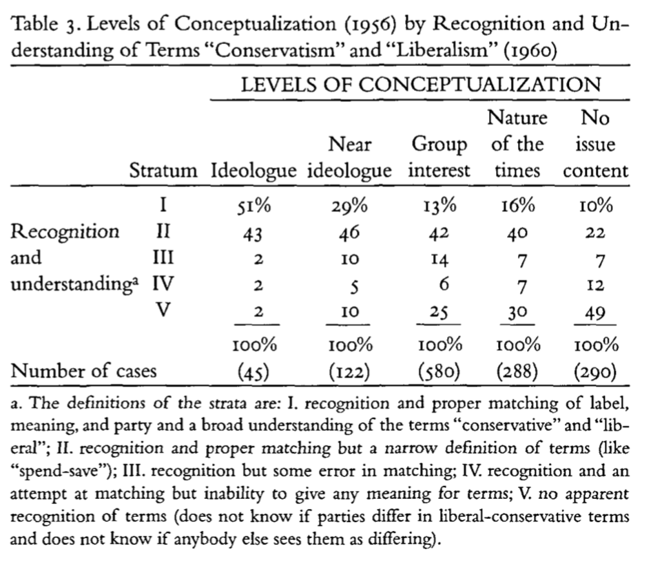 Next Converse considers these levels of conceptualization in 1956 with peoples ability to attach the correct ideological labels with political parties
