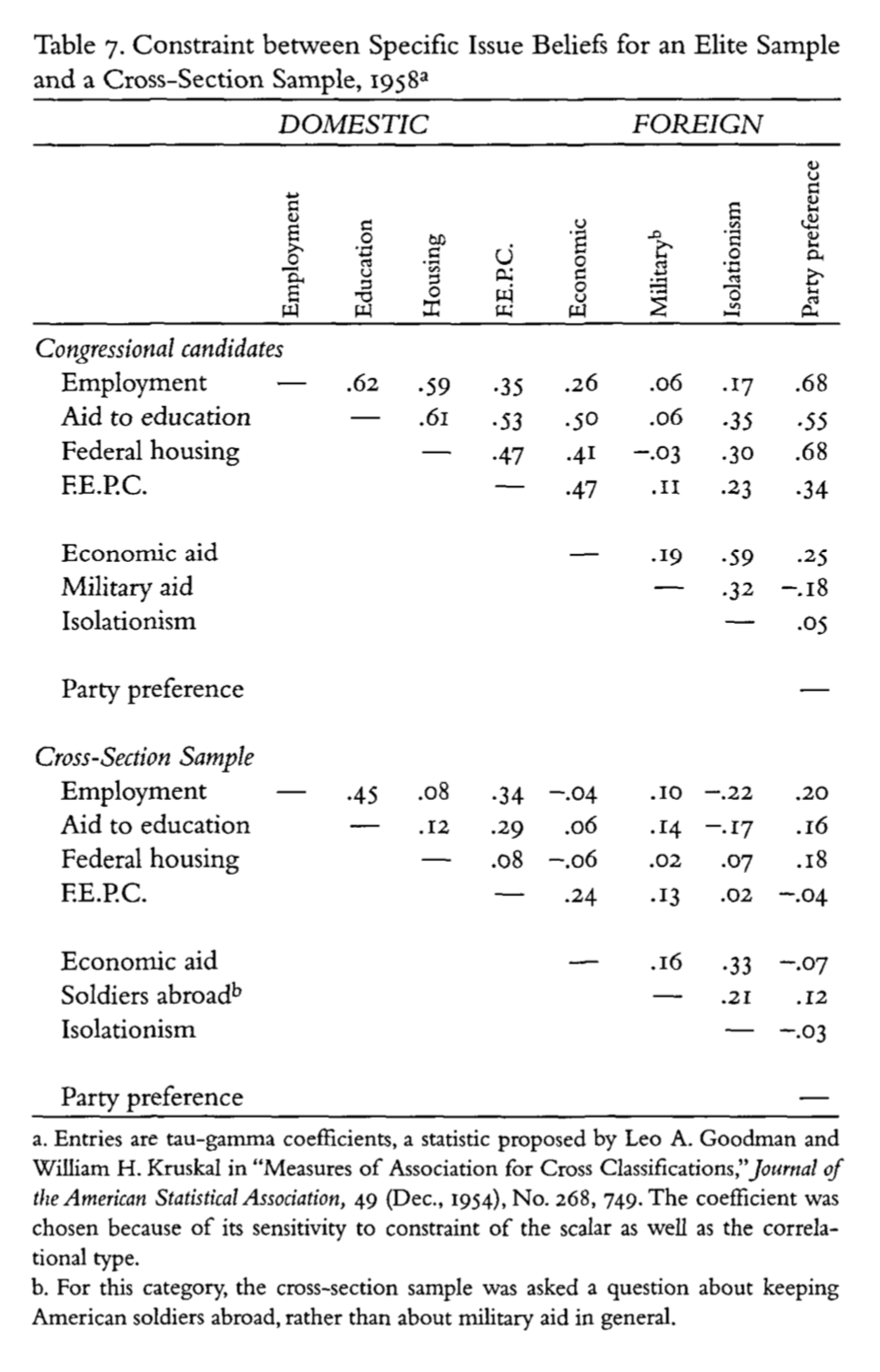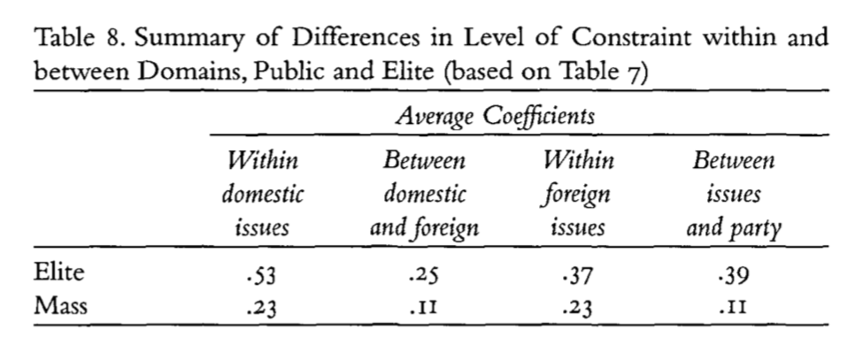 Next Converse considers the degree of constraint (measured by correlations) between issue elements in an elite (congressional candidates) compared to the mass public