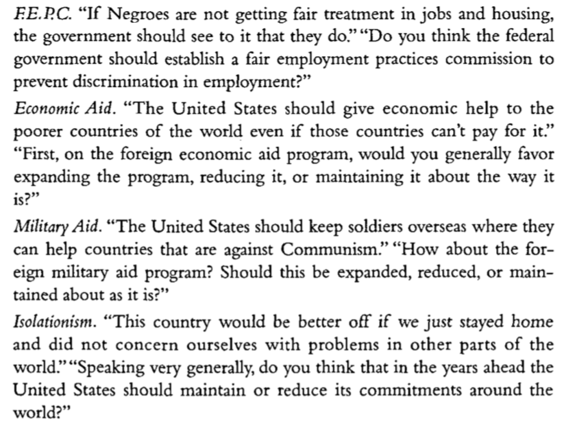 Converse considers the stability of responses over time, looking at data from 1958-1960 finding variation the strength of temporal correlations across surveys, and attributes this to the centrality of groups and the party system for the mass public