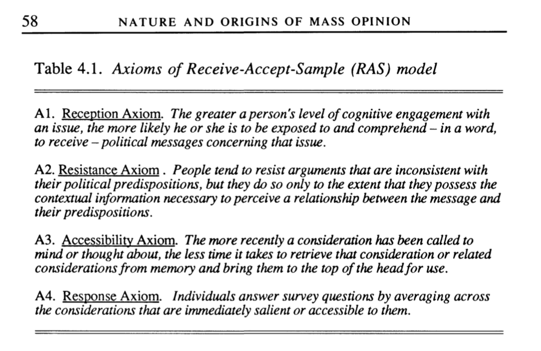 • Receive-Accept-Sample (Zaller and Feldman 1992, Zaller 1992)