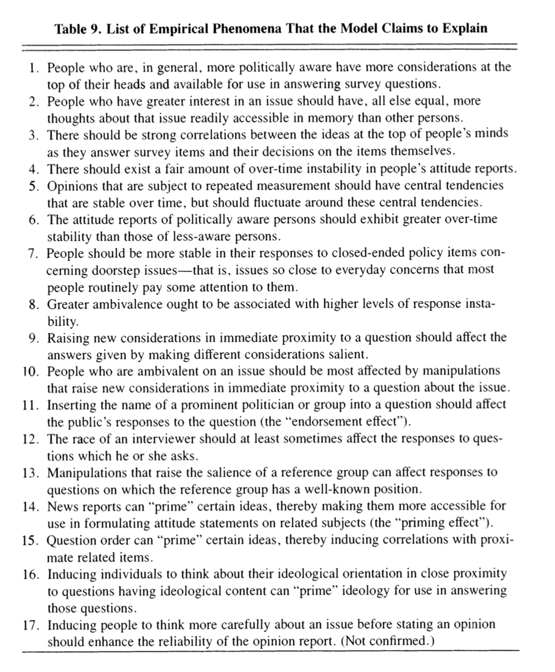 • Zaller and Feldman offer a simple theory of survey response built on three axioms that can explain both the high degrees of response instability that troubled Converse, as well as persistent response effects where simple changes to the wording or order of questions dramatically alters responses.