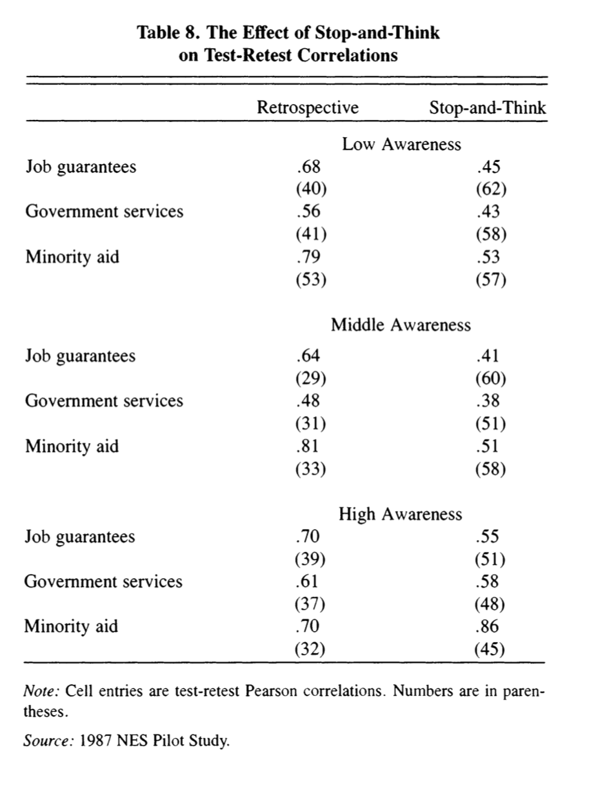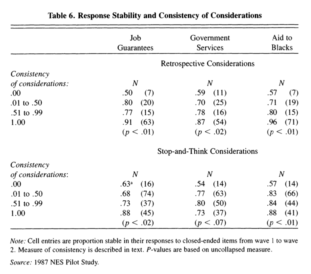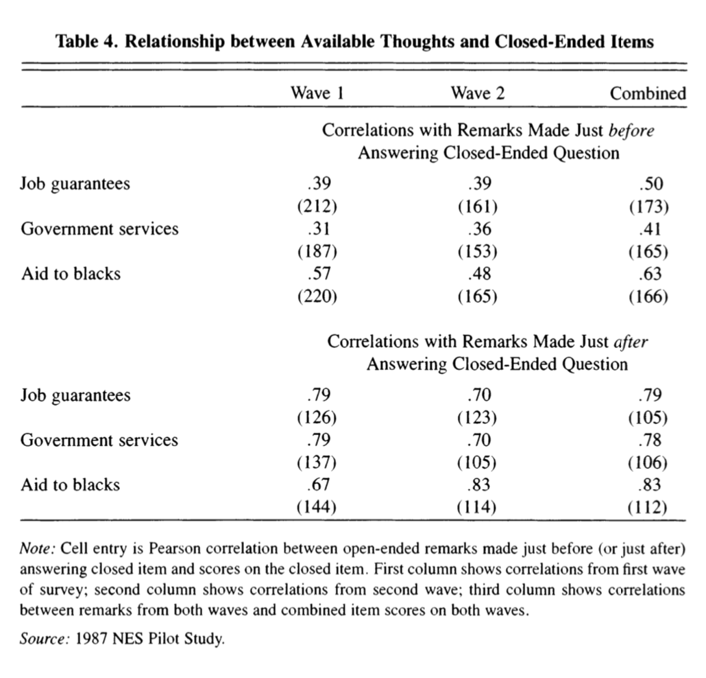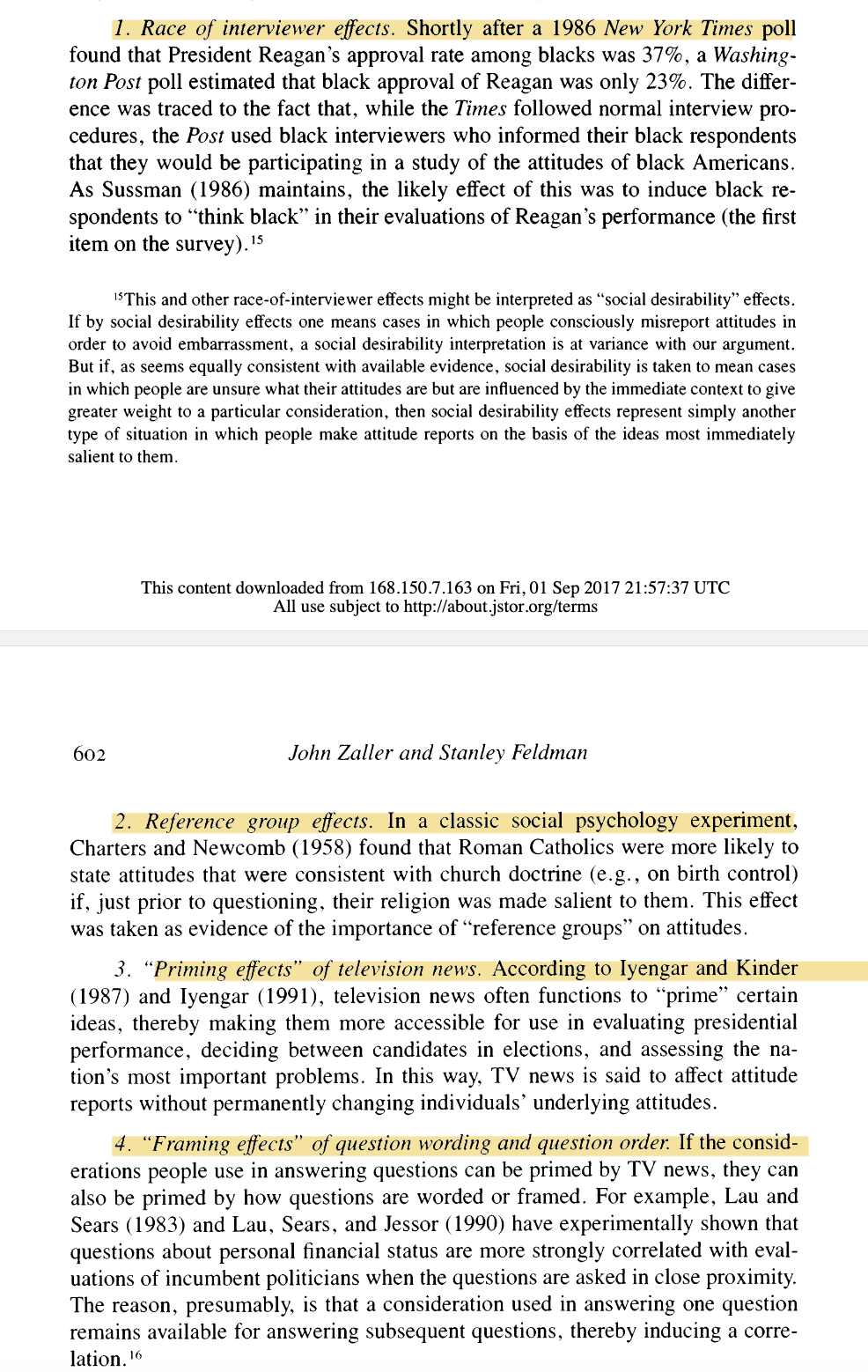 “… people are using the questionnaire to decide what their”attitudes” are (Bishop, Oldendick, and Tuchfarber 1984; Zaller 1984; Feldman 1990).” (p. 582)