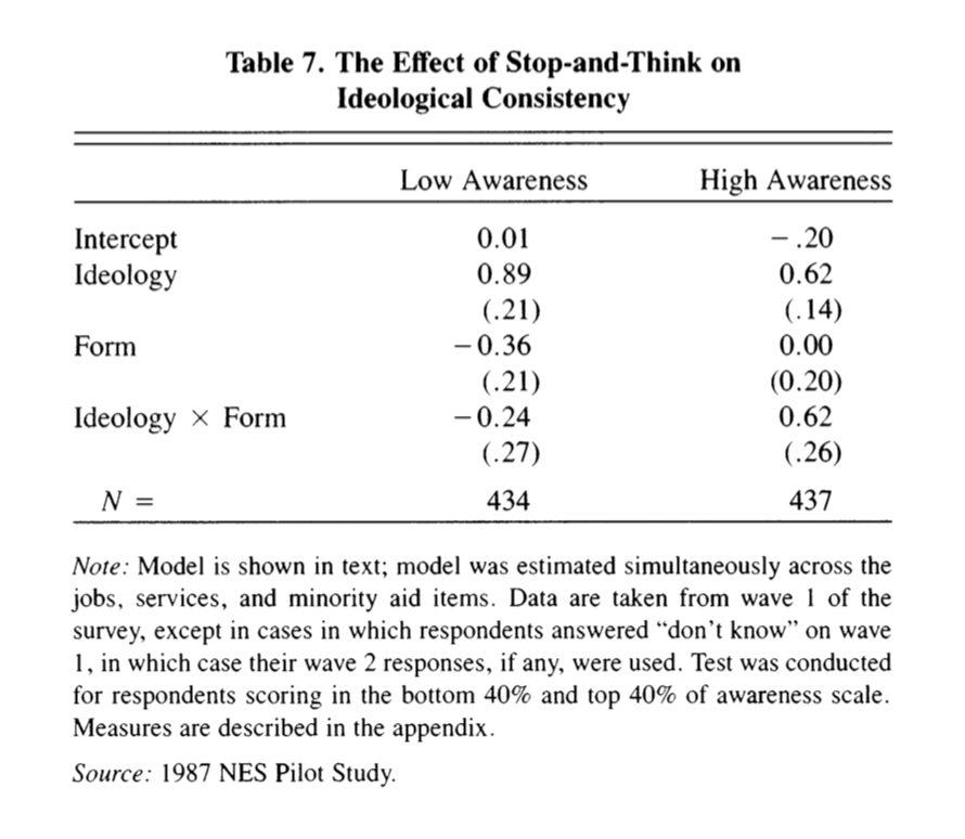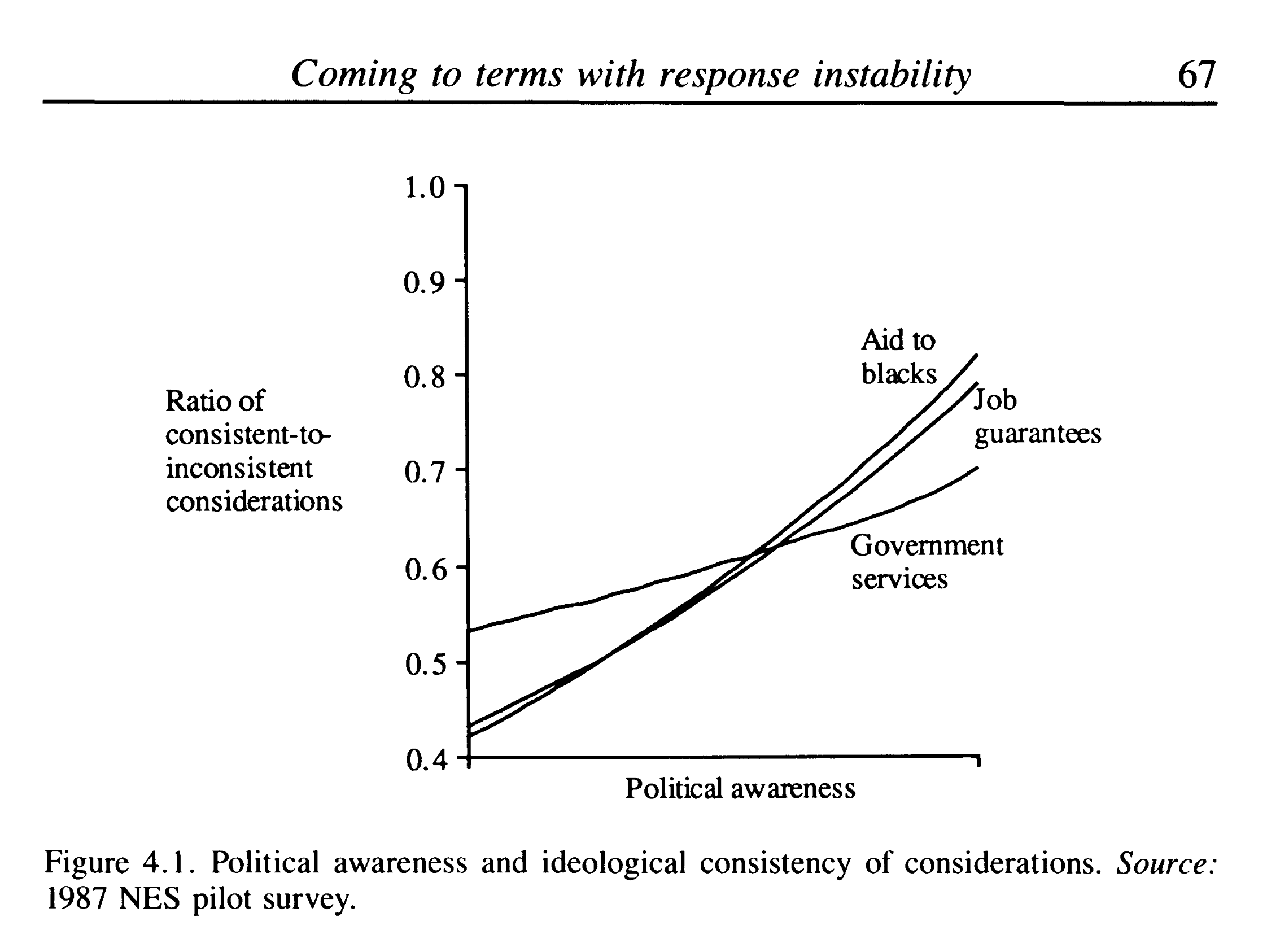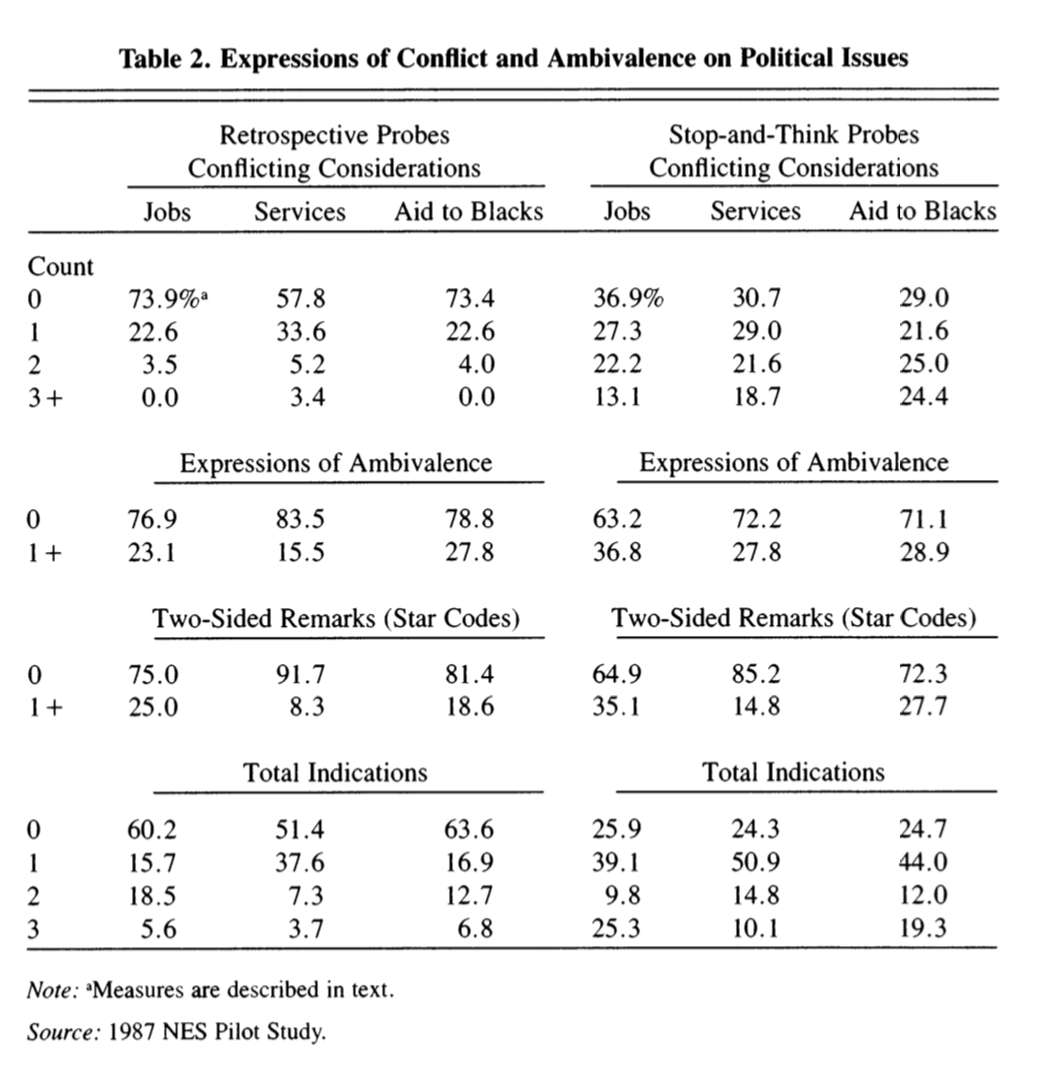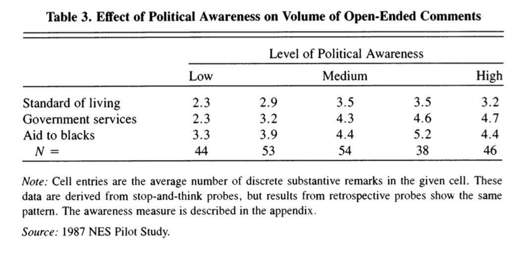 “… people are using the questionnaire to decide what their”attitudes” are (Bishop, Oldendick, and Tuchfarber 1984; Zaller 1984; Feldman 1990).” (p. 582)