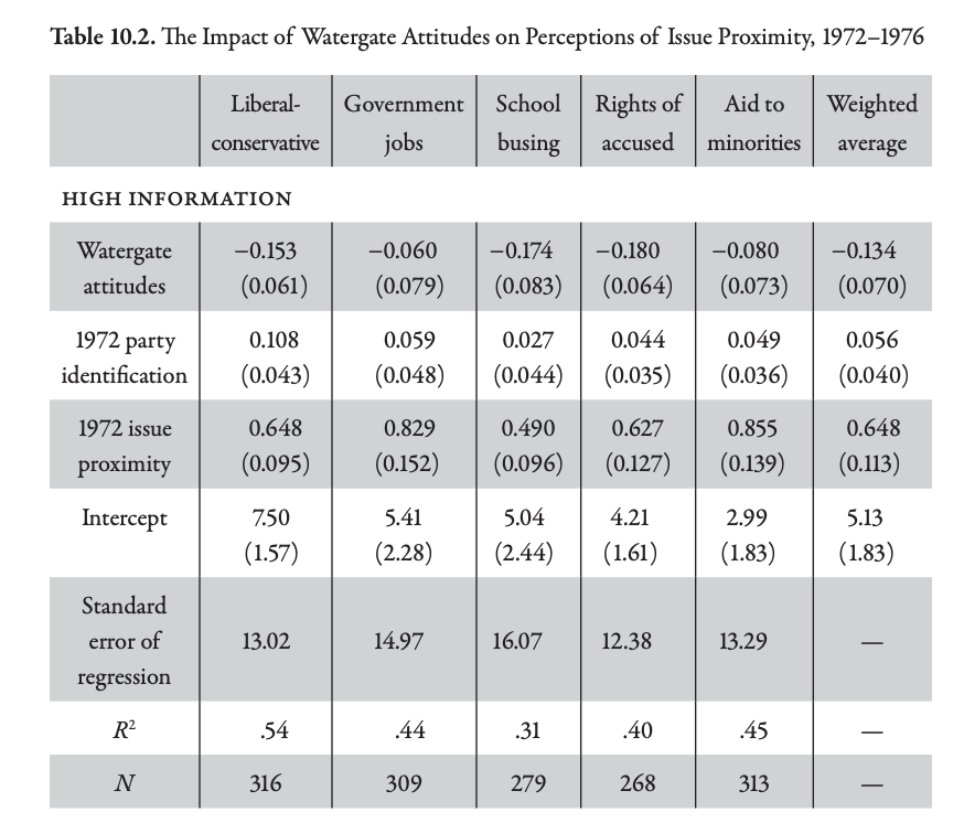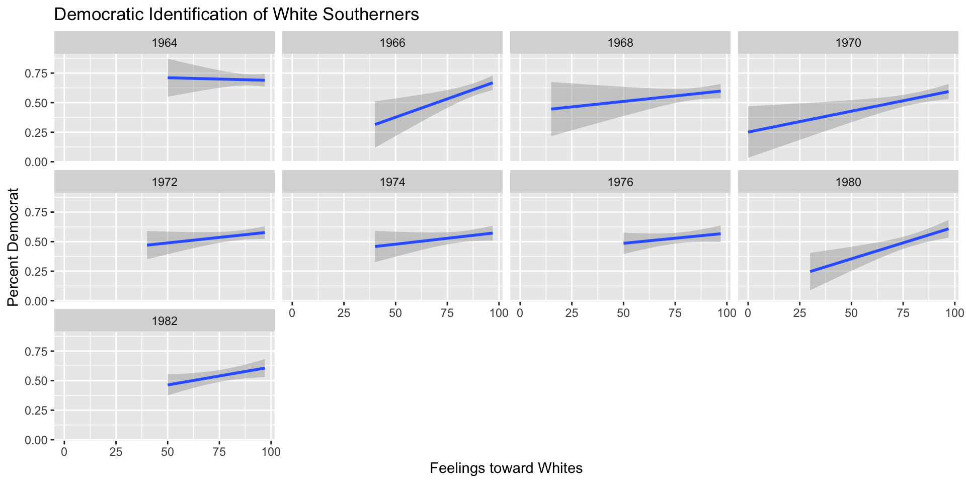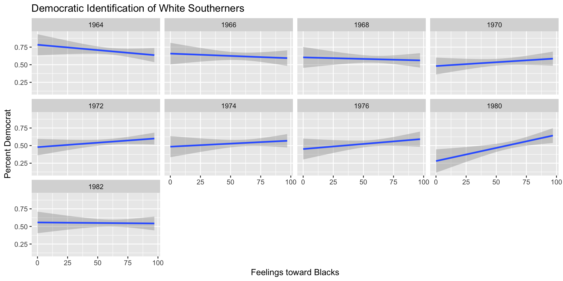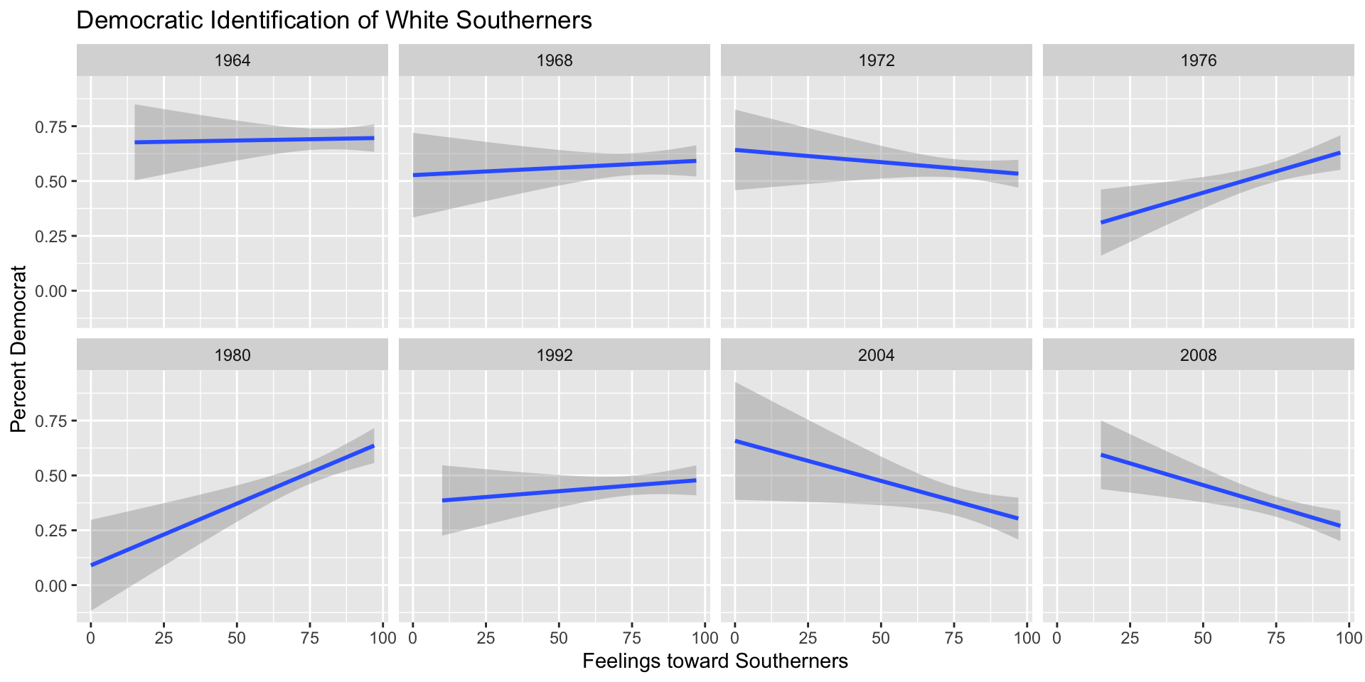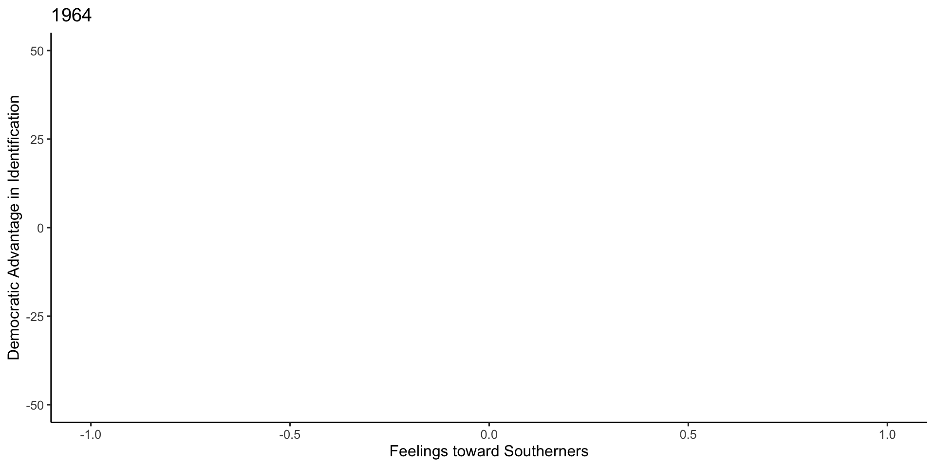The results indicate that the Democratic partisan advantage in 1964 among white southerners who expressed neutral attitudes toward “southerners” was almost 25 percentage points, while the corresponding advantage among those who expressed very warm feelings toward “southerners” was more than twice as large, almost 55 percentage points