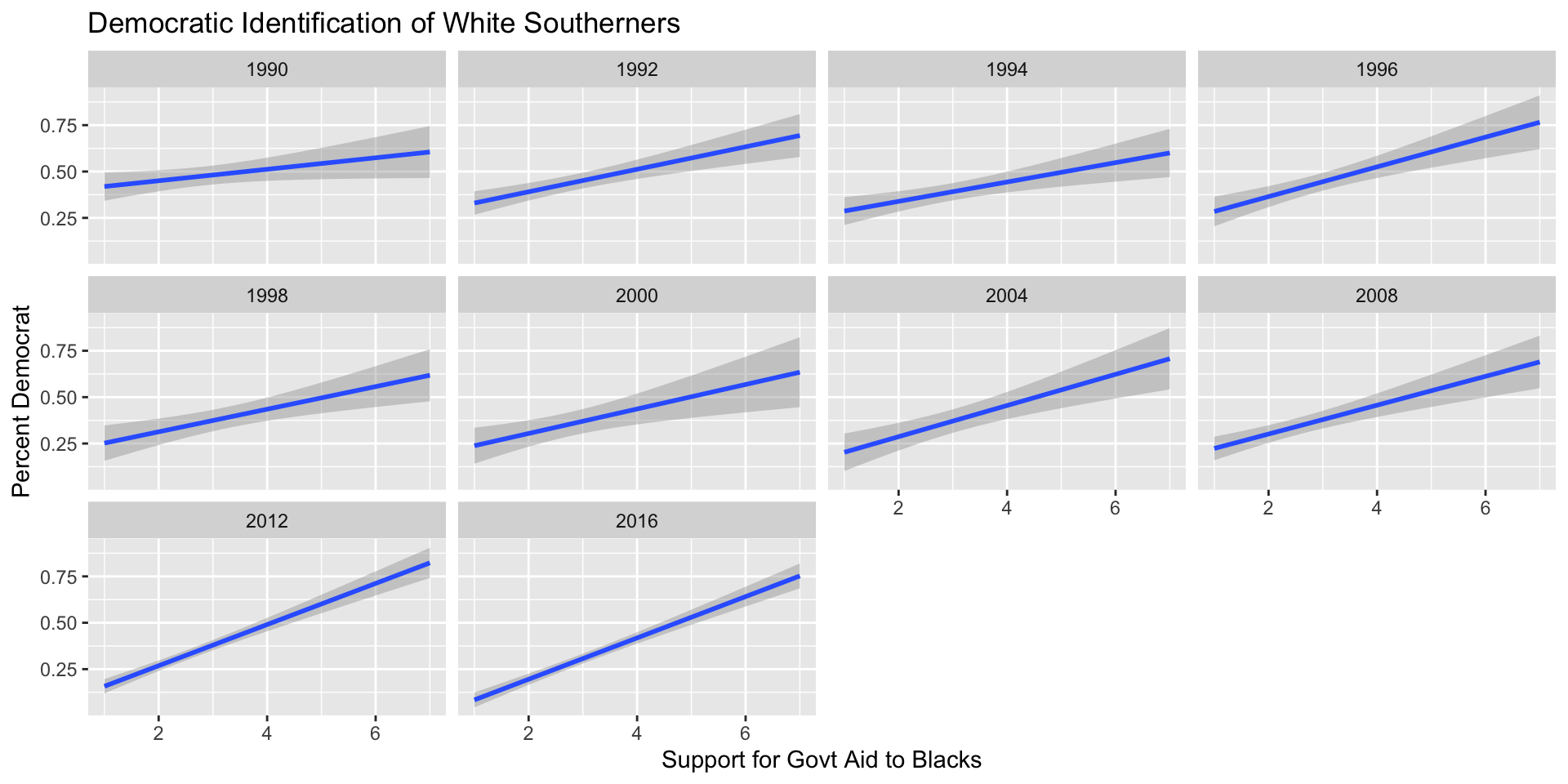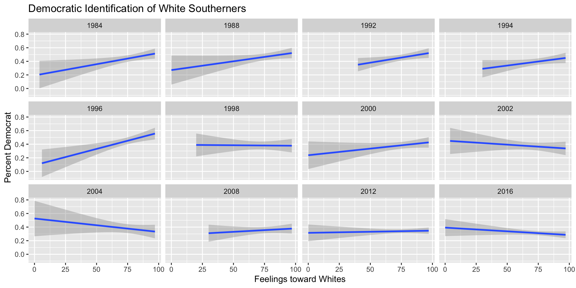 In the following tabs, I’ve plot some linear trends in Democratic Identification by year for: