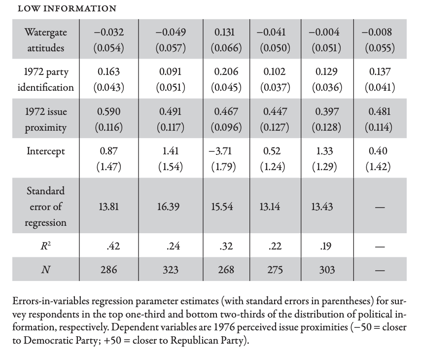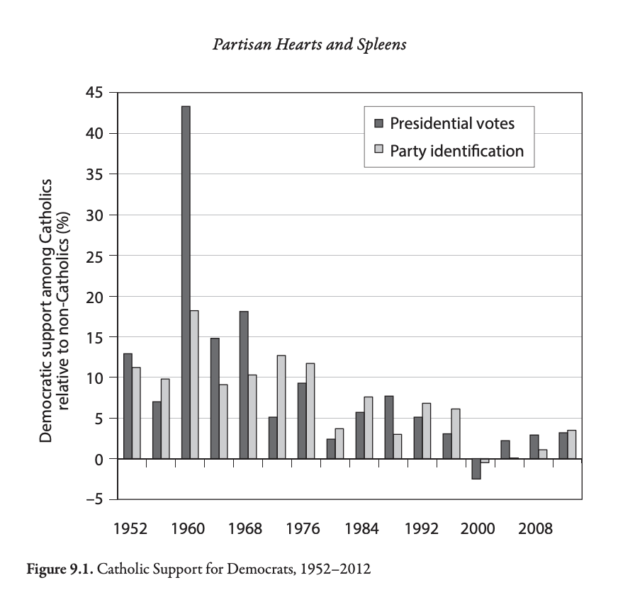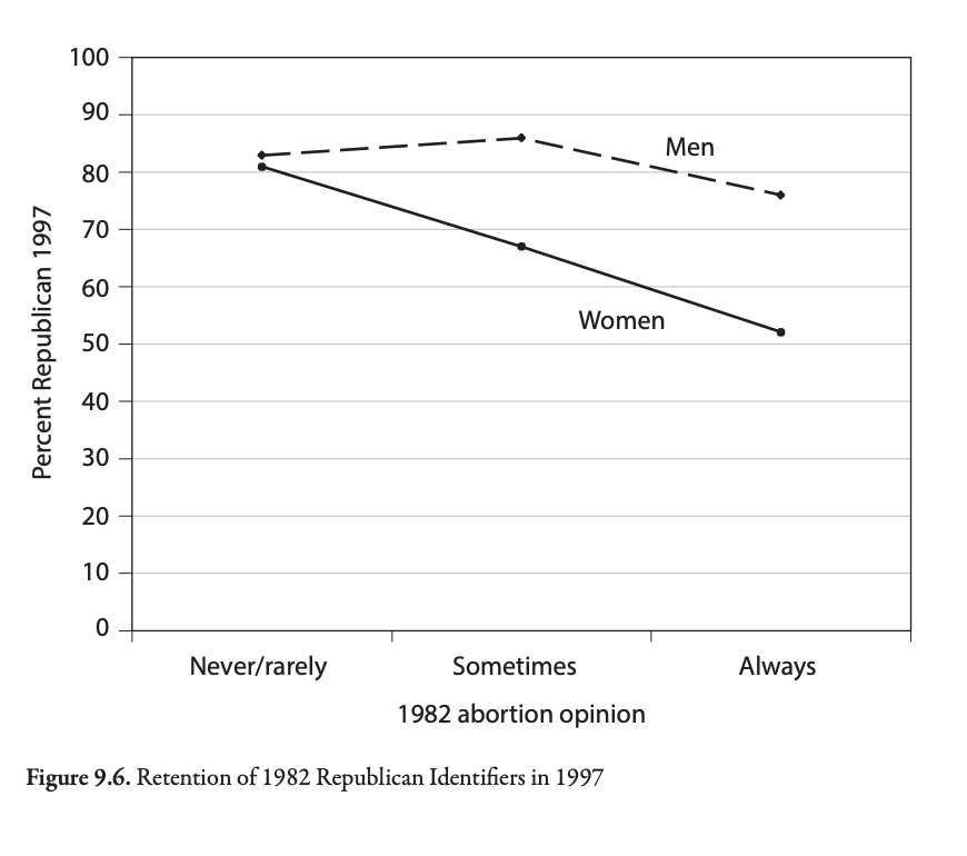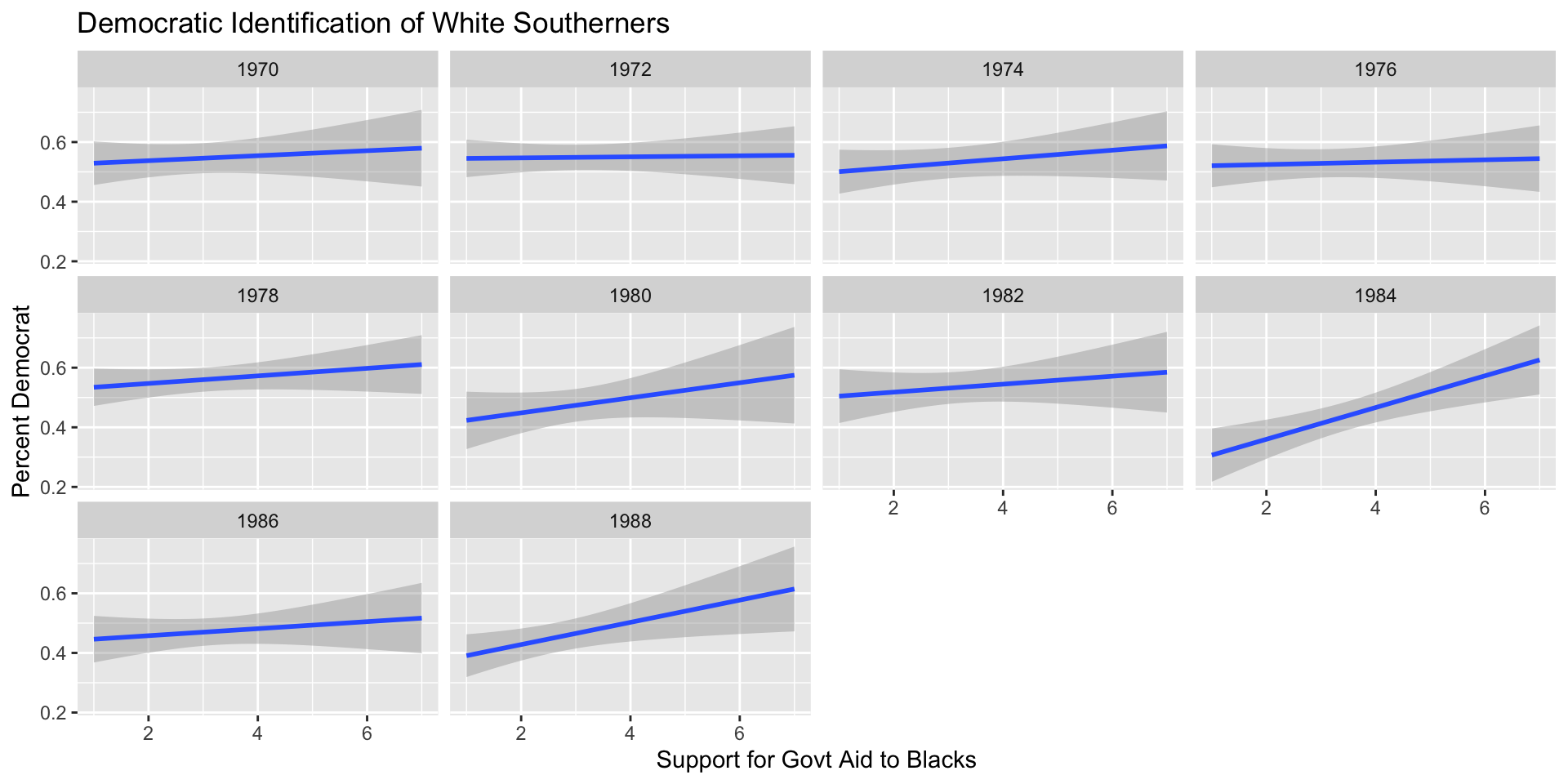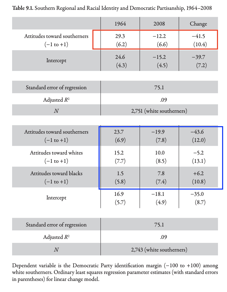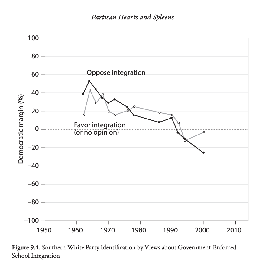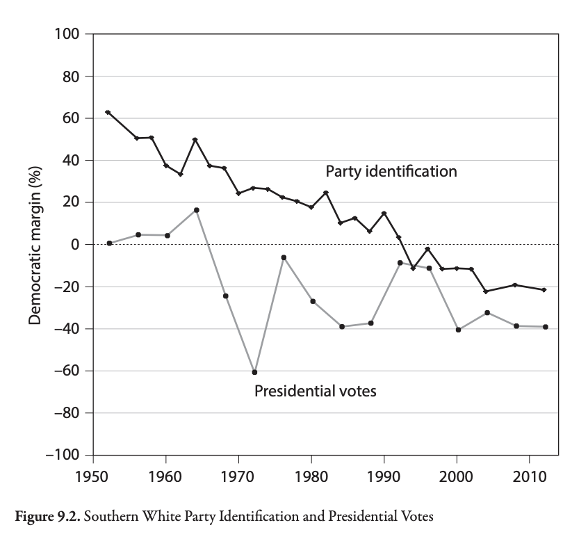 Achen and Bartels present an alternative interpretation of realignment in the south emphasizing the role of social identities over standard accounts that emphasized partisan policies using the following evidence: