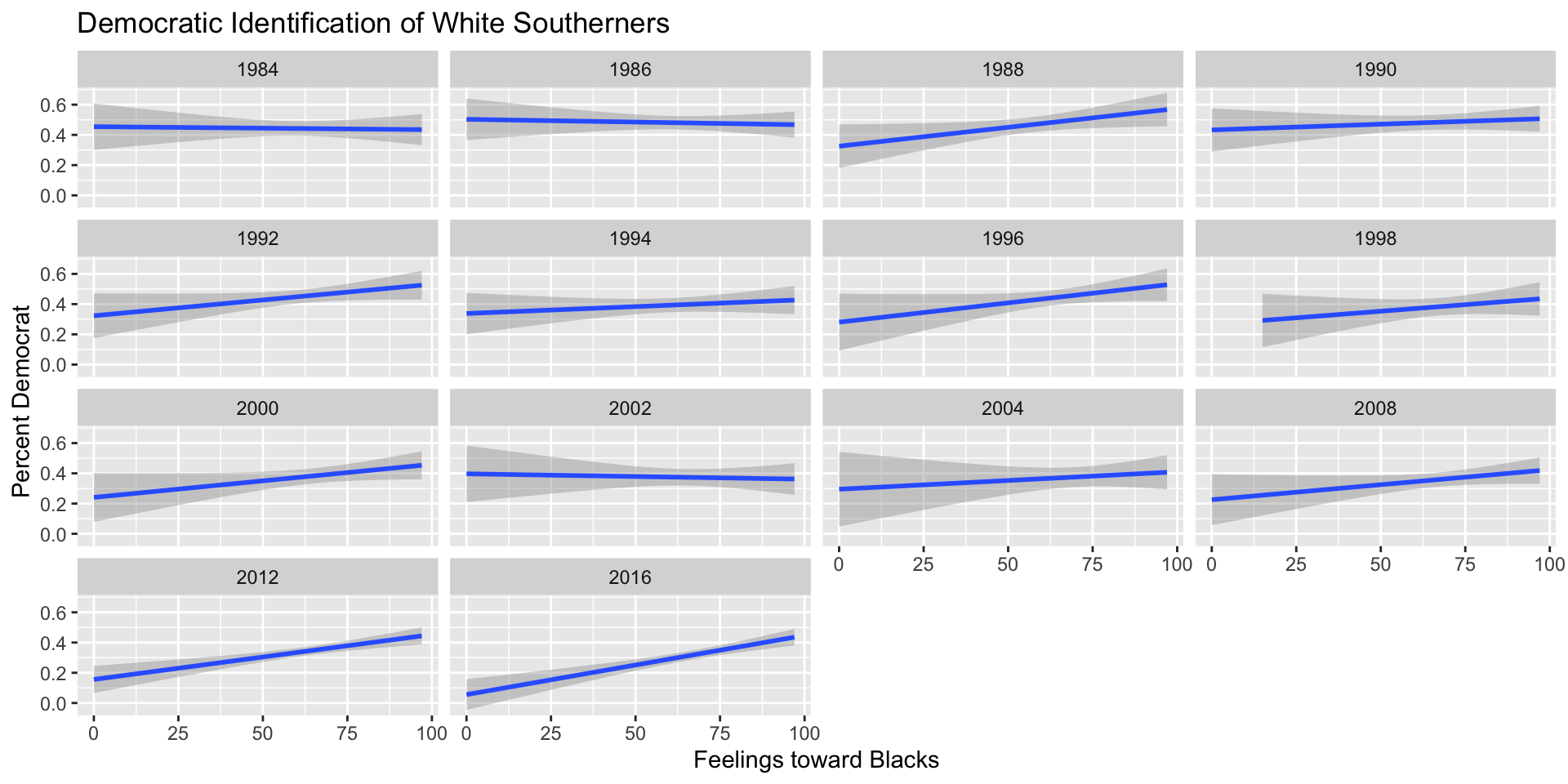 Why? If realignment was driven by attitudes about racial policy, what would we expect to see in the figure below?