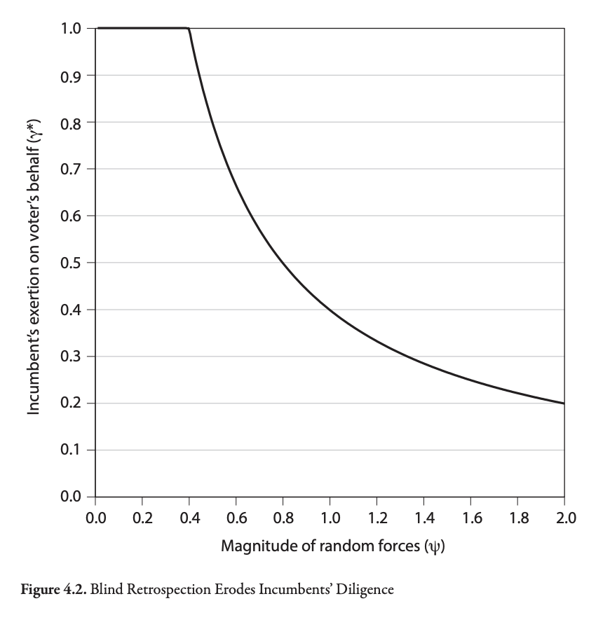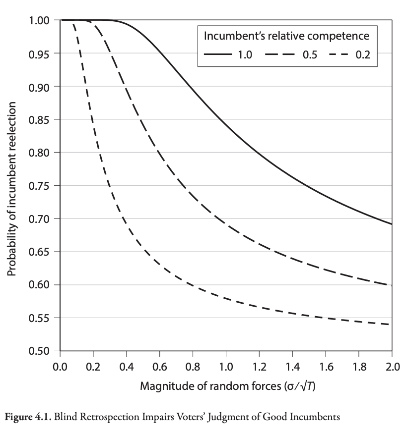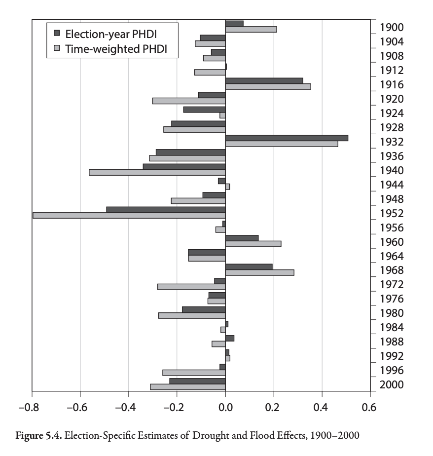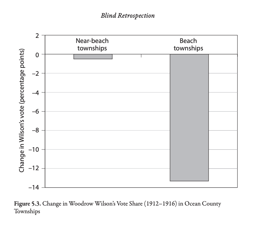 In Chapter 5, Achen and Bartels present evidence that voters enage in blind retrospection, punishing elected officials for events outside of their control.