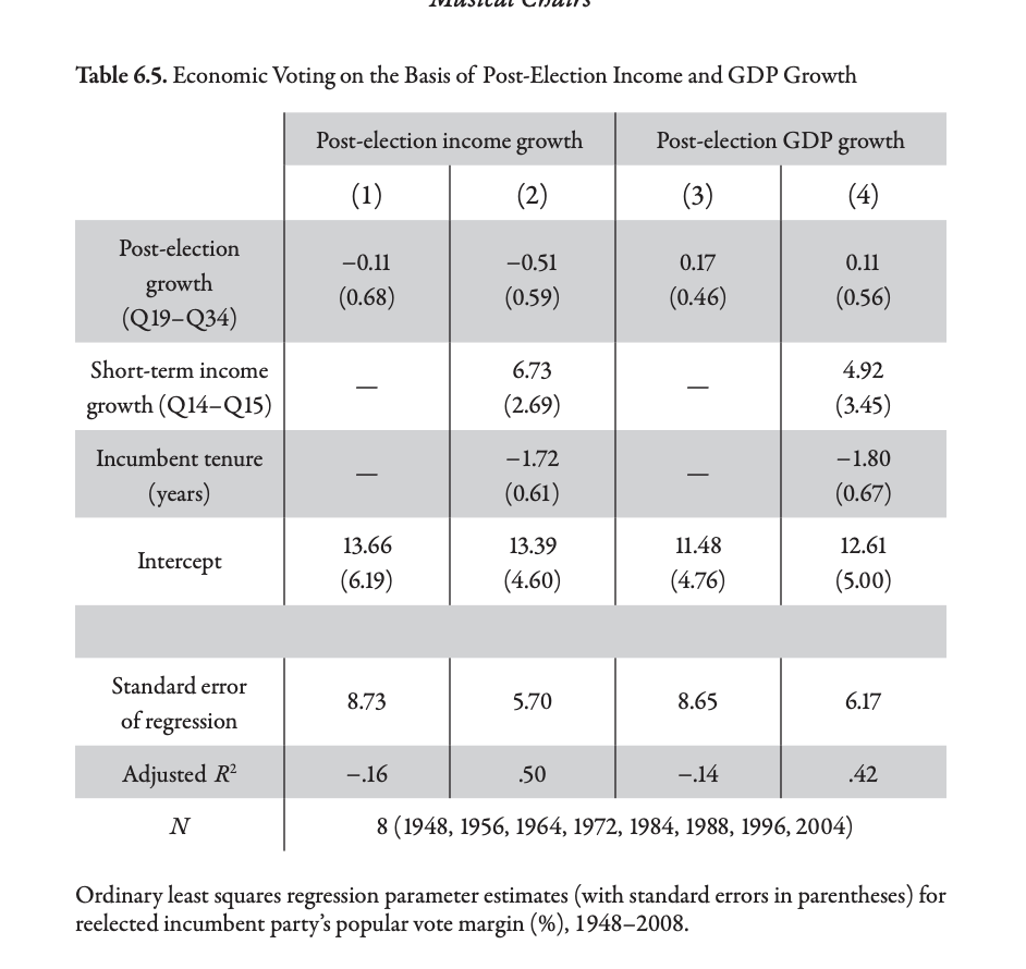 Only growth in the last year meaningfully predicts incumbent vote share.