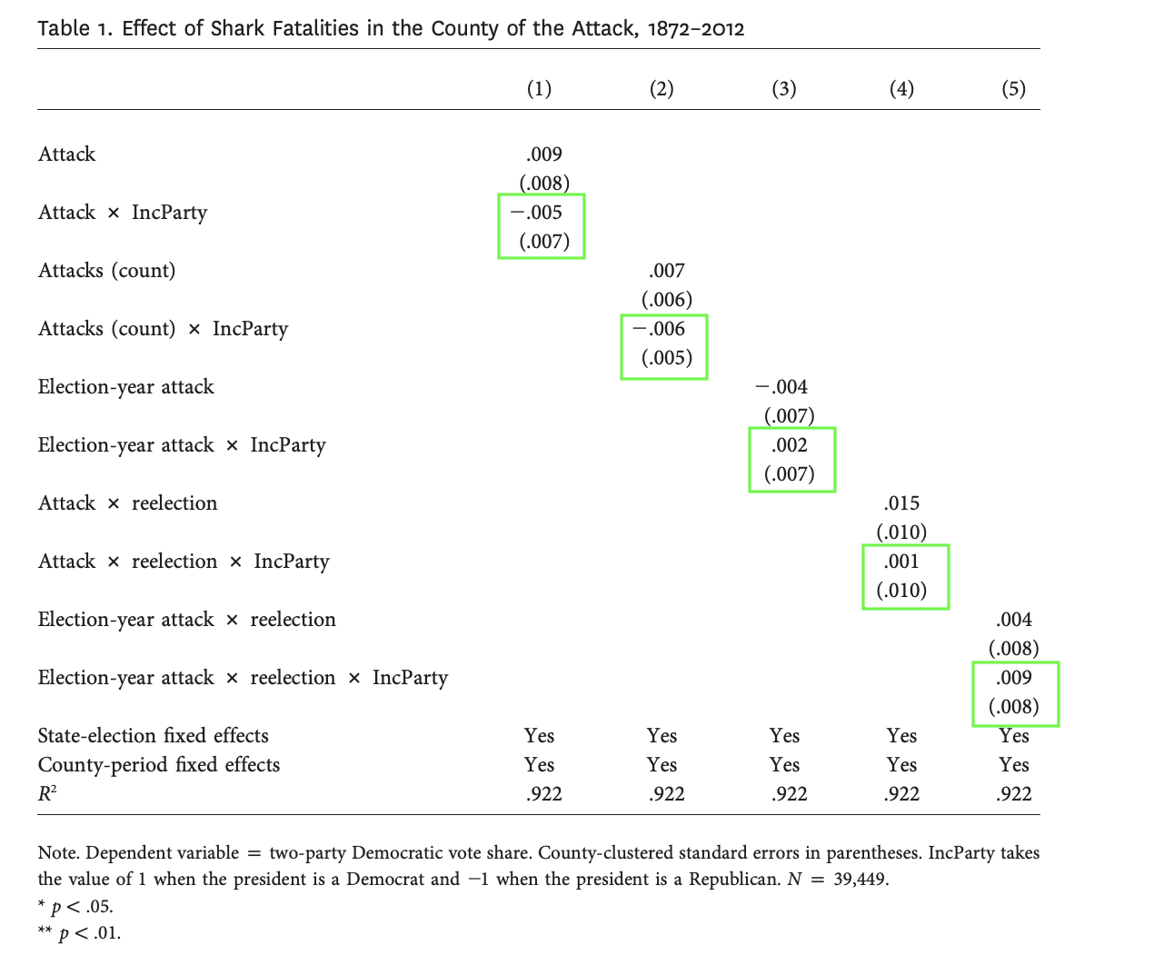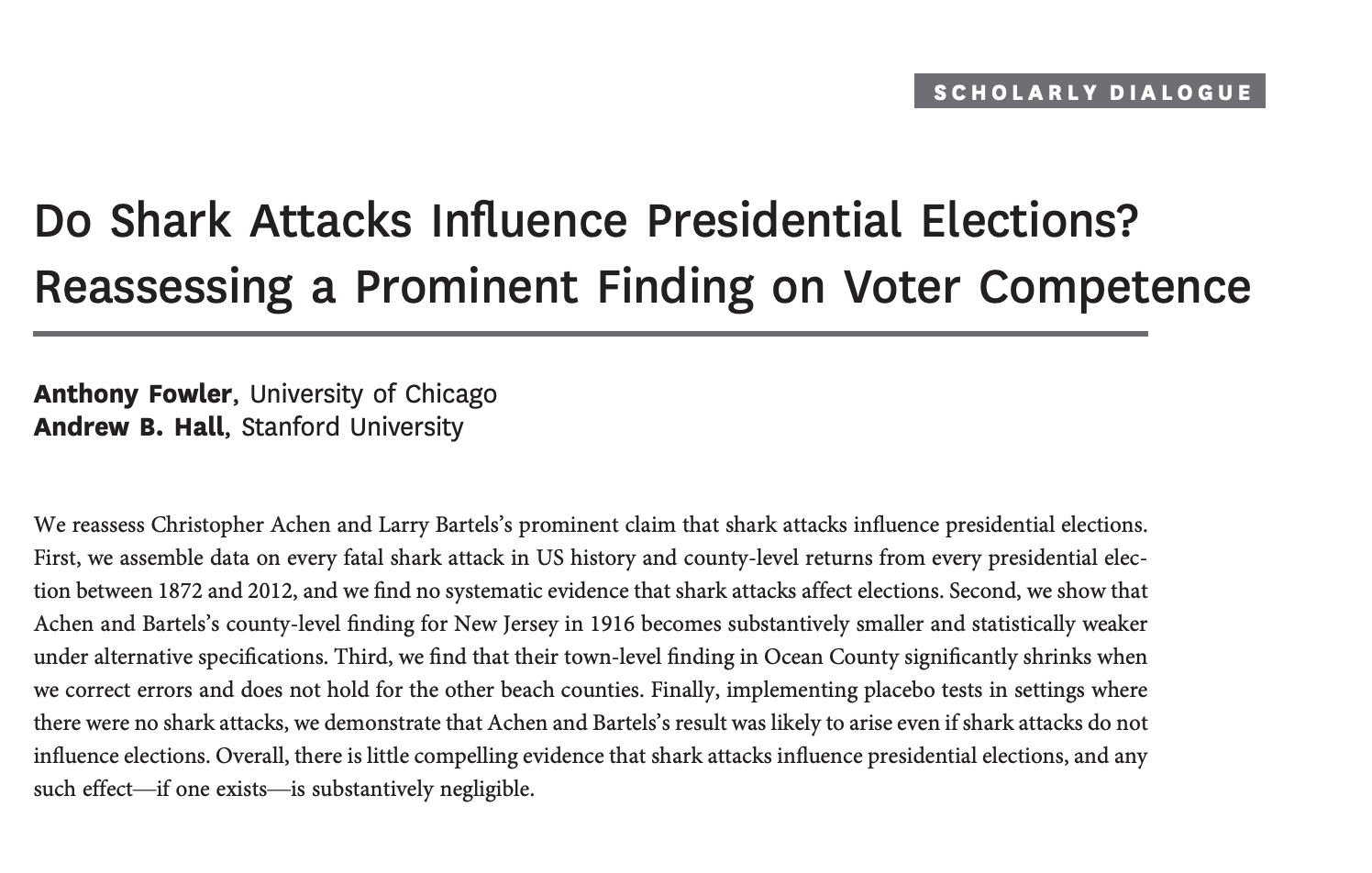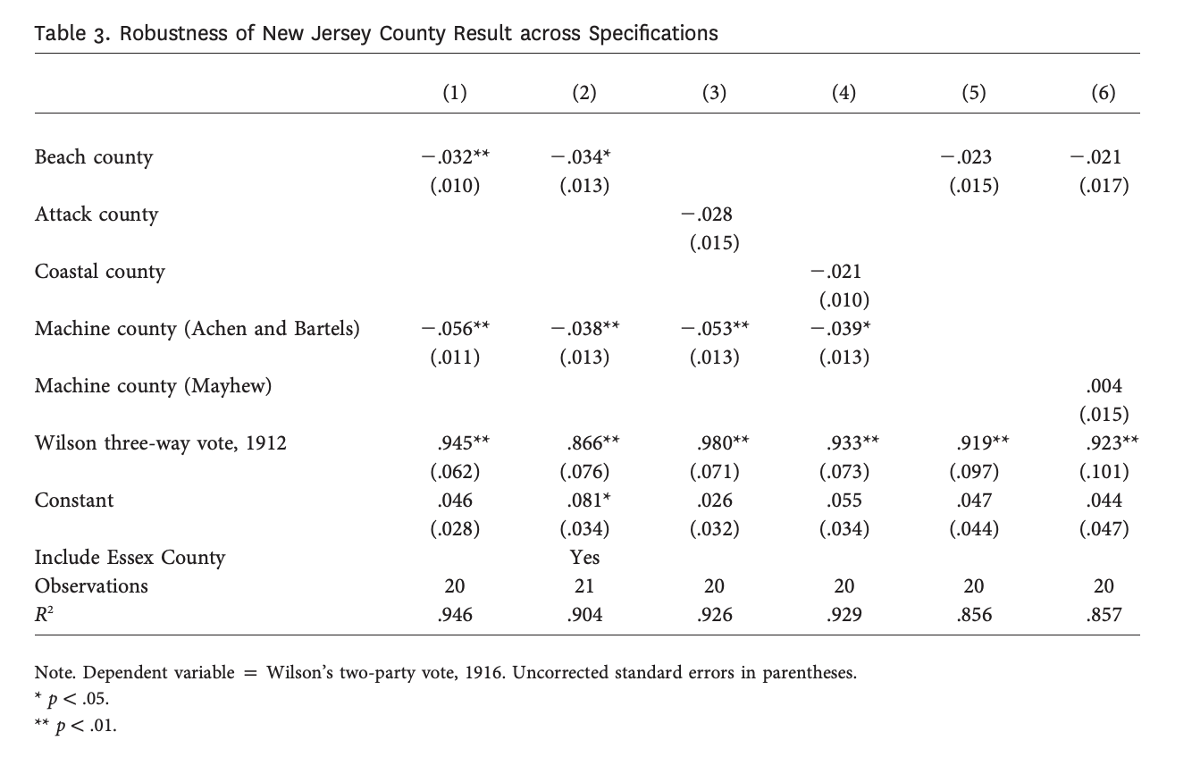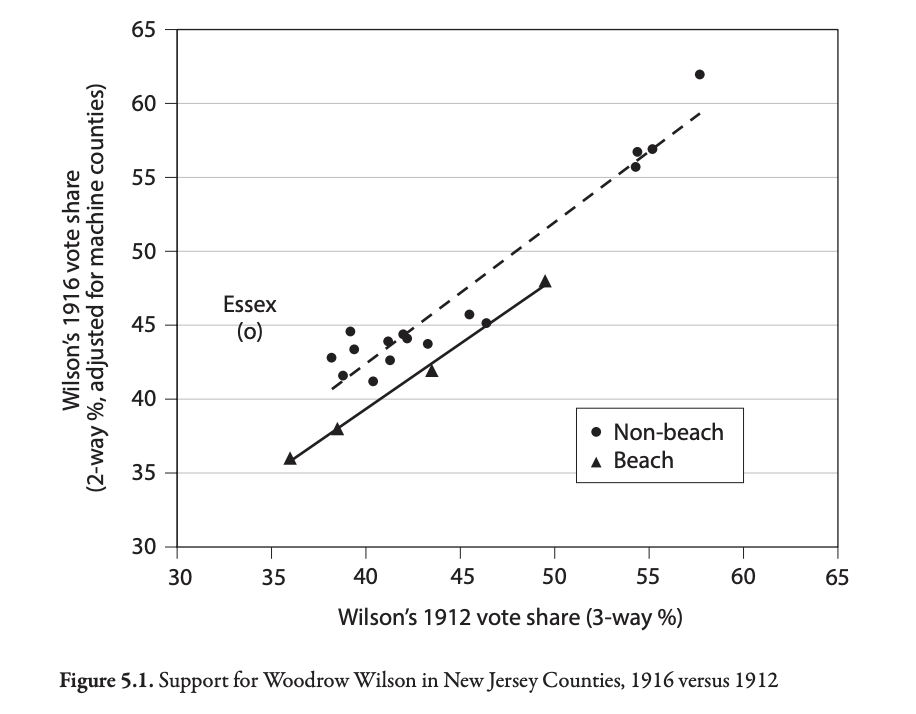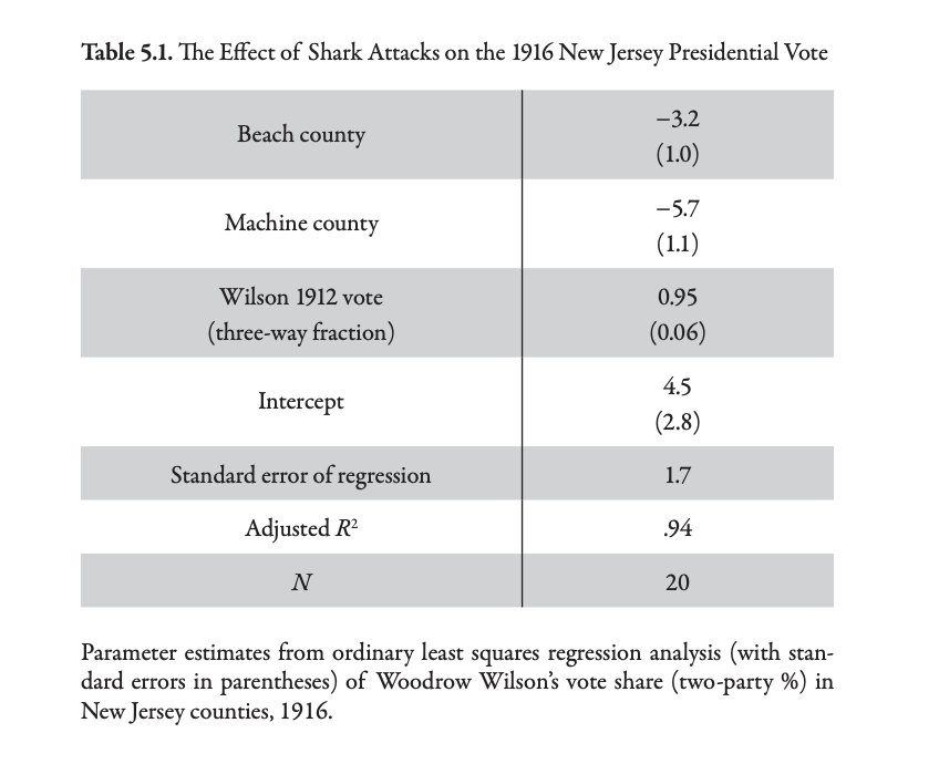 They show that Woodrow Wilson’s vote totals in 1916 appear to be lower in beach counties during a summer when shark attacks in New Jersey were particularly salient