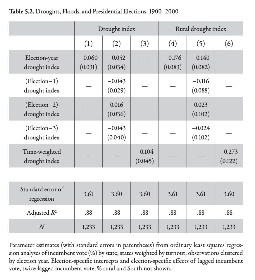 They suggest this phenomena is more general, by showing how extreme weather (droughts and floods) negatively impacts incumbent vote share.