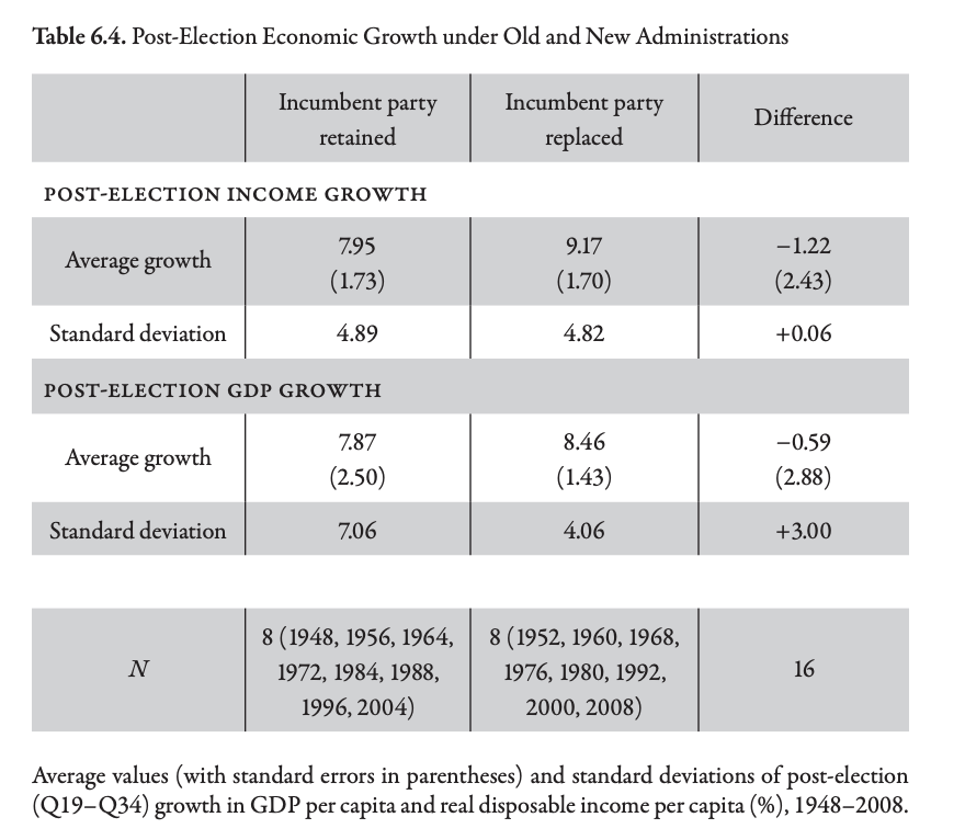 Re-electing incumbents does not reliably improve economic outcomes (Table 6.4 & 6.5)