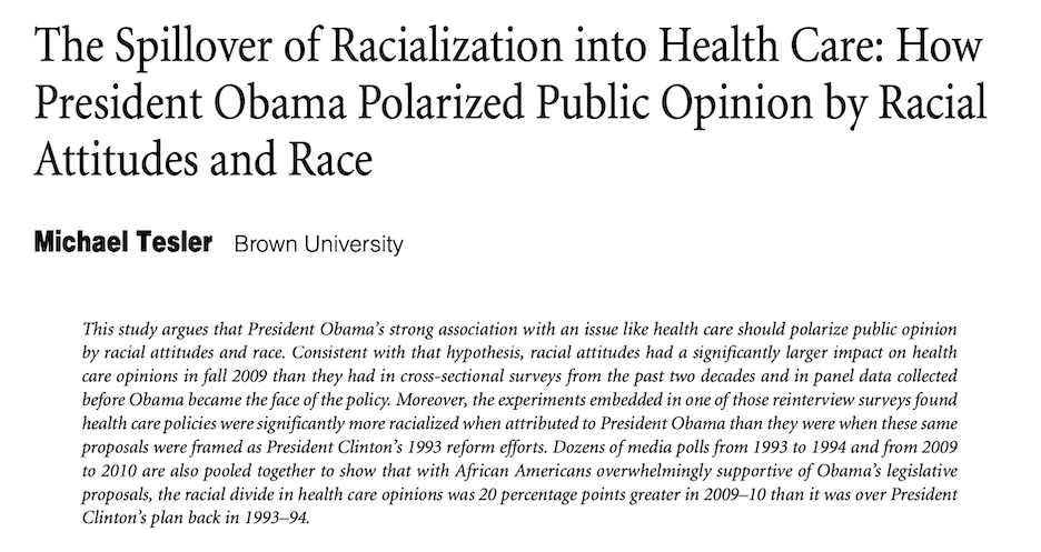 Racial attitudes become more tightly linked to health care preferences once Obama becomes the face of reform