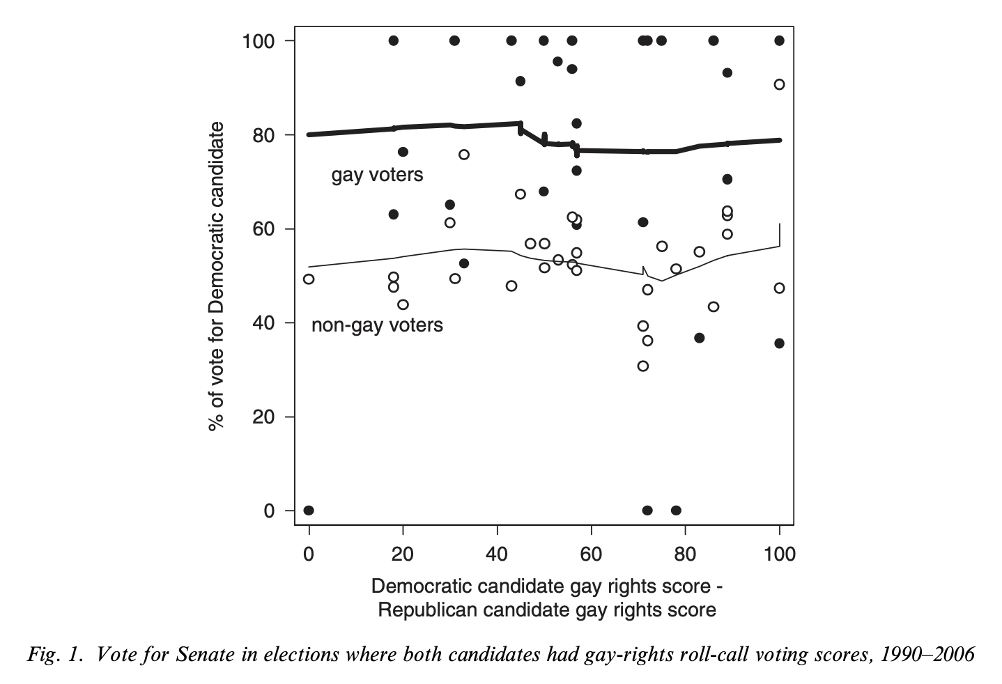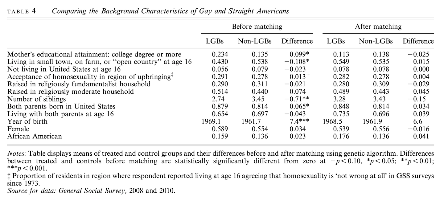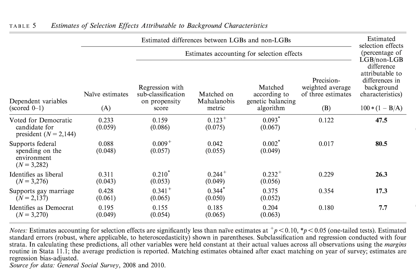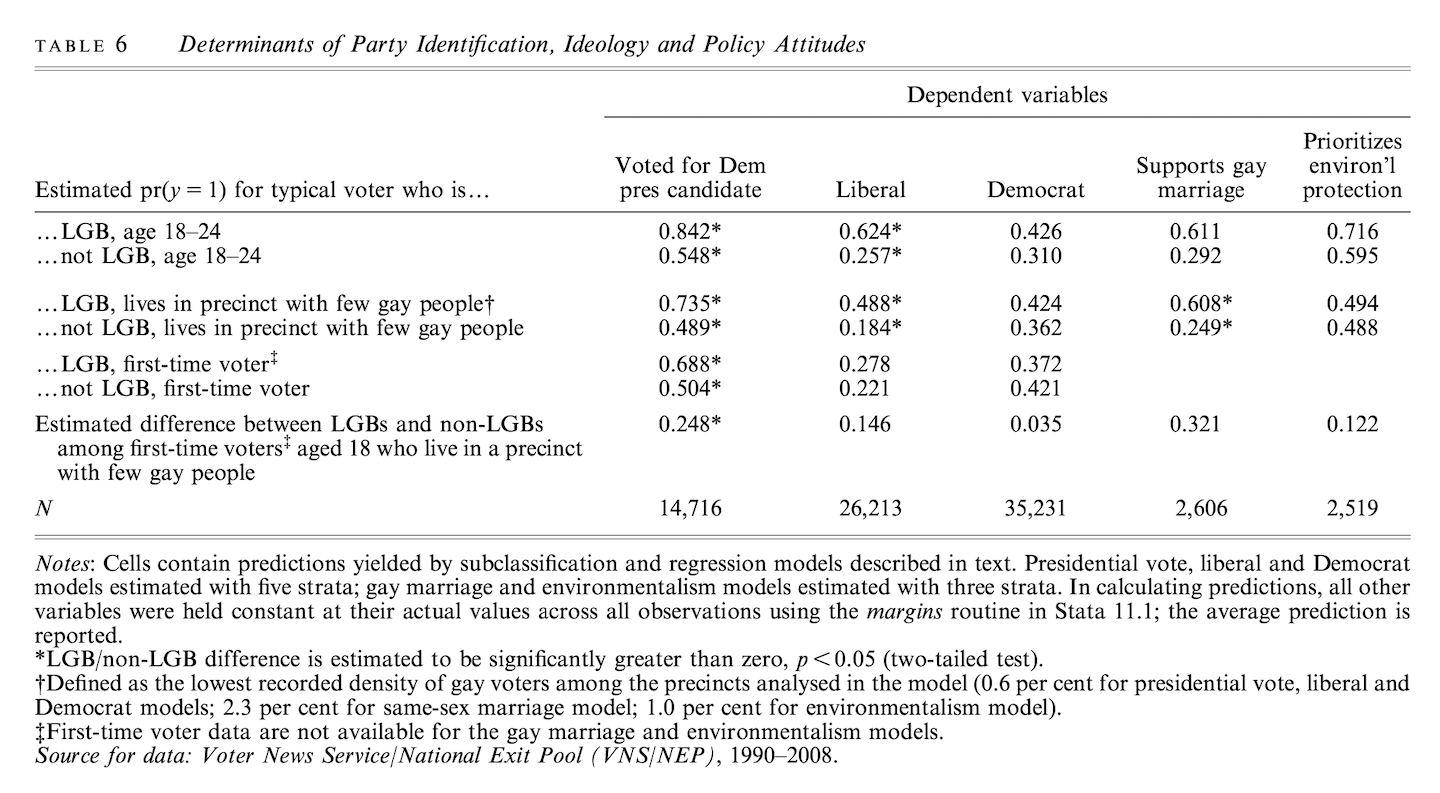 “If selection is at work in making a group’s members politically distinctive, the ceteris paribus differences in political views between group members and the general population should be reduced after conditioning on the effects of background characteristics that shape identity choice and are also known to be determinants of political views.”