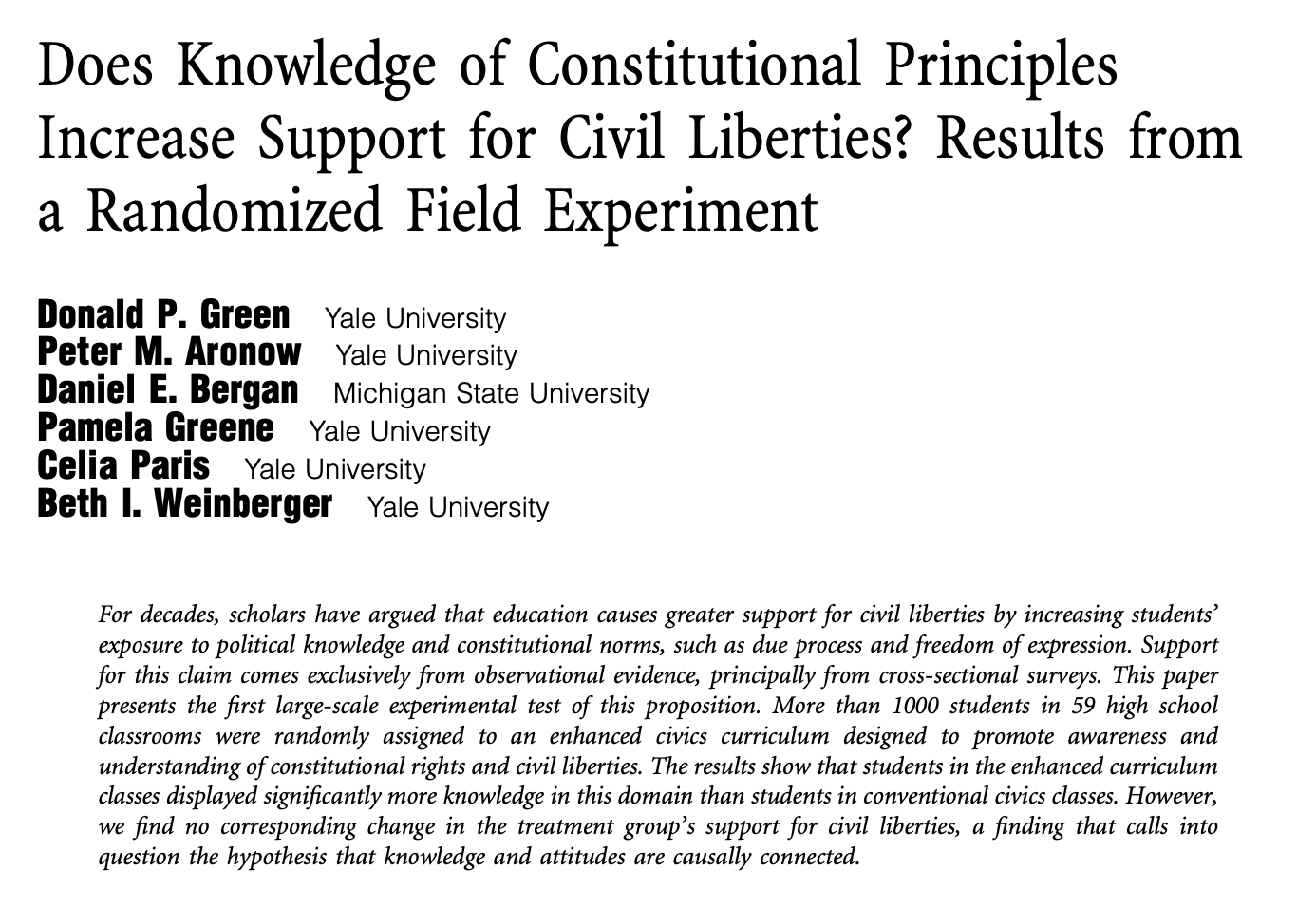 Green et al. (2011) randomly assign some students within schools to receive and enhanced civics education